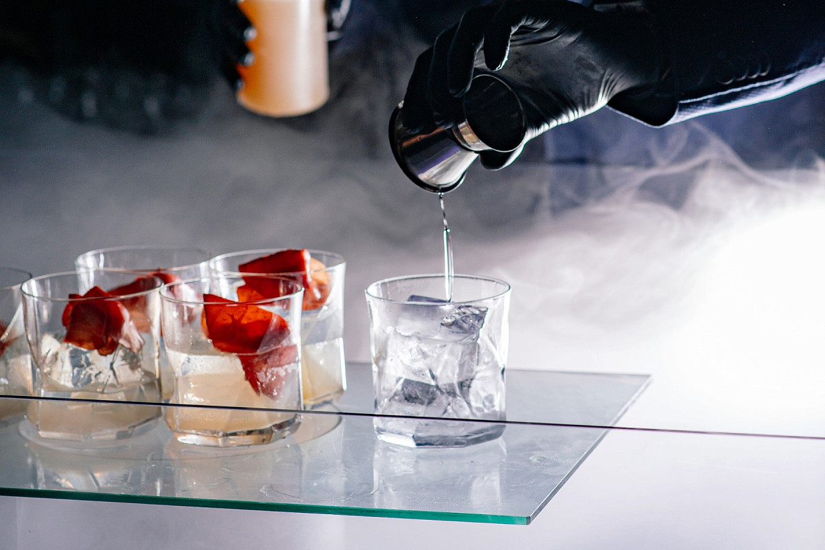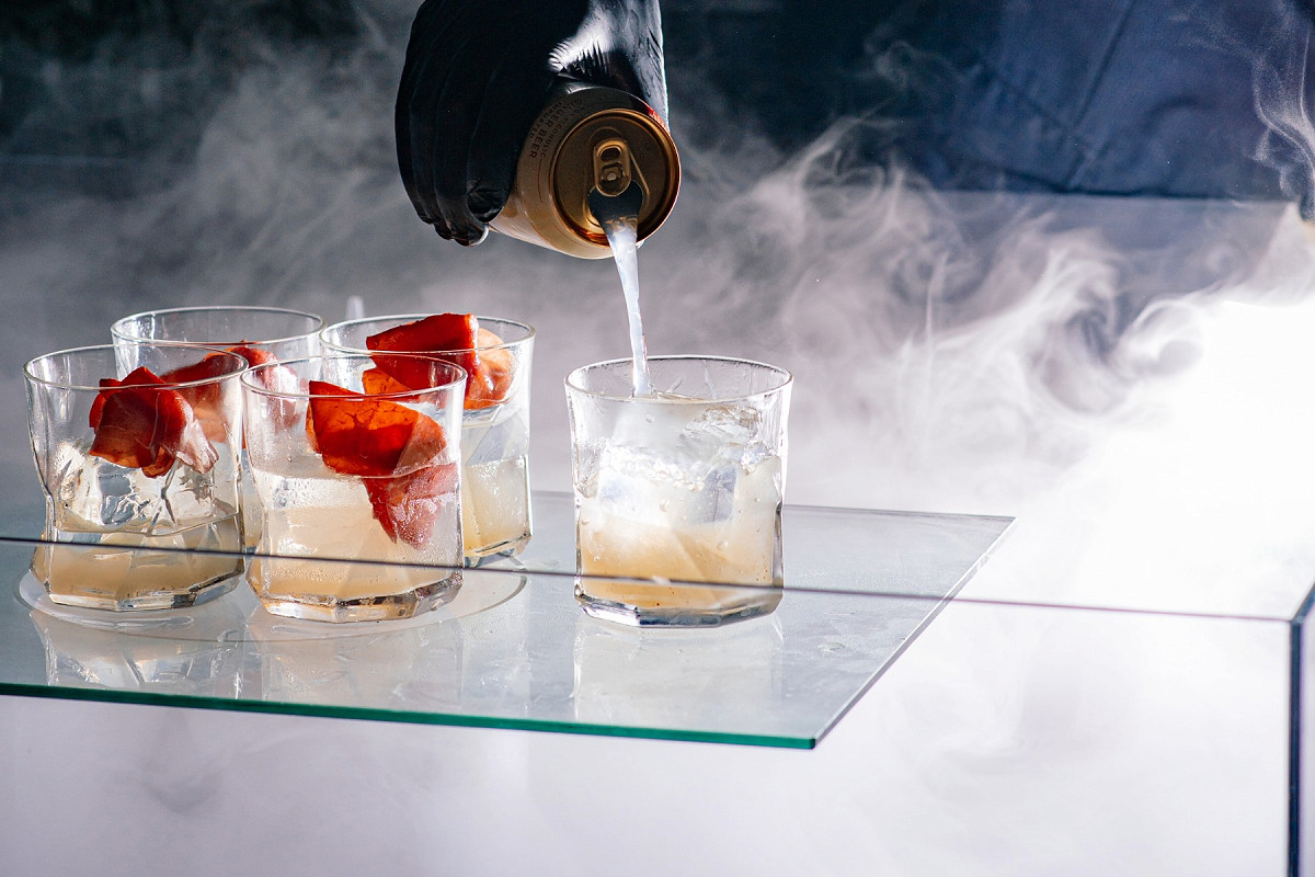 Omoda Signature drink podávaný z Infinity Cloud. Cocktail na základu infuzovaného ginu s kampotským pepřem, limetkovou šťávou, sodou a zázvorovým pivem. Součástí byla i sušená šunka a kostka ledu s logem Omoda.