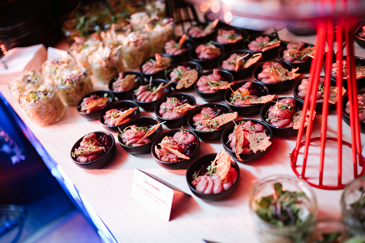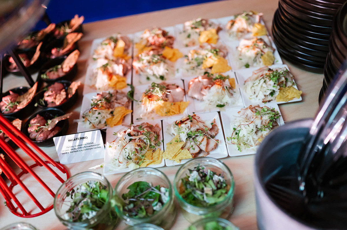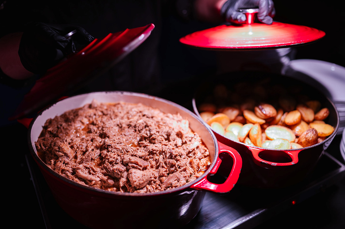 Raut pro 400 osob servírovaný na našem konceptu Signature byl dramaturgií večera sám o sobě. Na stolech s předkrmy hosté našli kachní paštiku s brusinkami v malých skleničkách, salát s hruškou a gorgonzolou. Jako hlavní chod jsme podávali trhané vepřové s omáčkou demi-glace, vegetariánskou lilkovo-cuketovou variaci Toreta, nebo thajské kari s kokosovým mlékem. Kdo chtěl, mohl zůstat u osvědčených řízečků, ale lákaly i nové kombinace chutí.