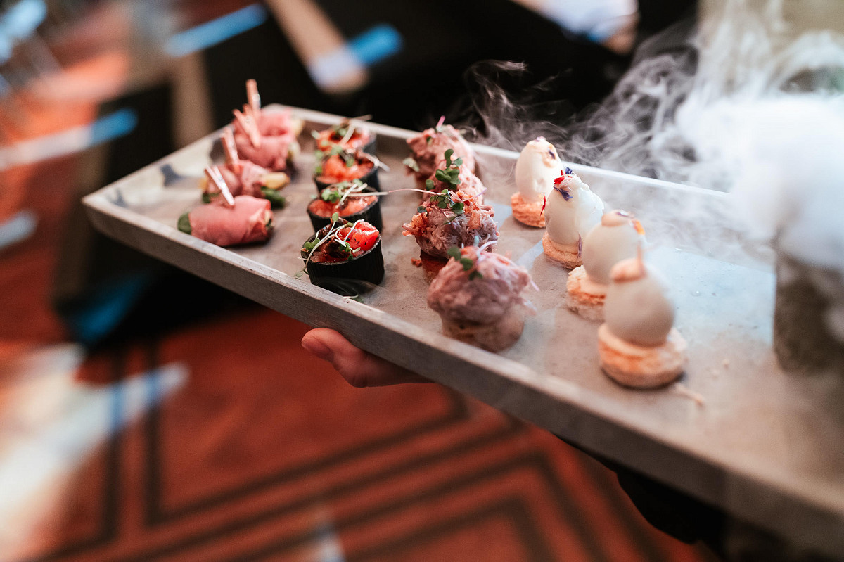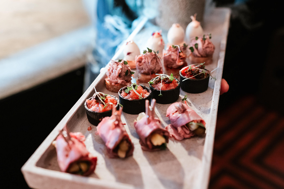 Od úvodních kanapek jsme vsadili na jednoduchost a eleganci. Křepelčí vajíčko s holandskou omáčkou, lososový tatarák s kapary nebo roastbeef s nakládanou zeleninou.