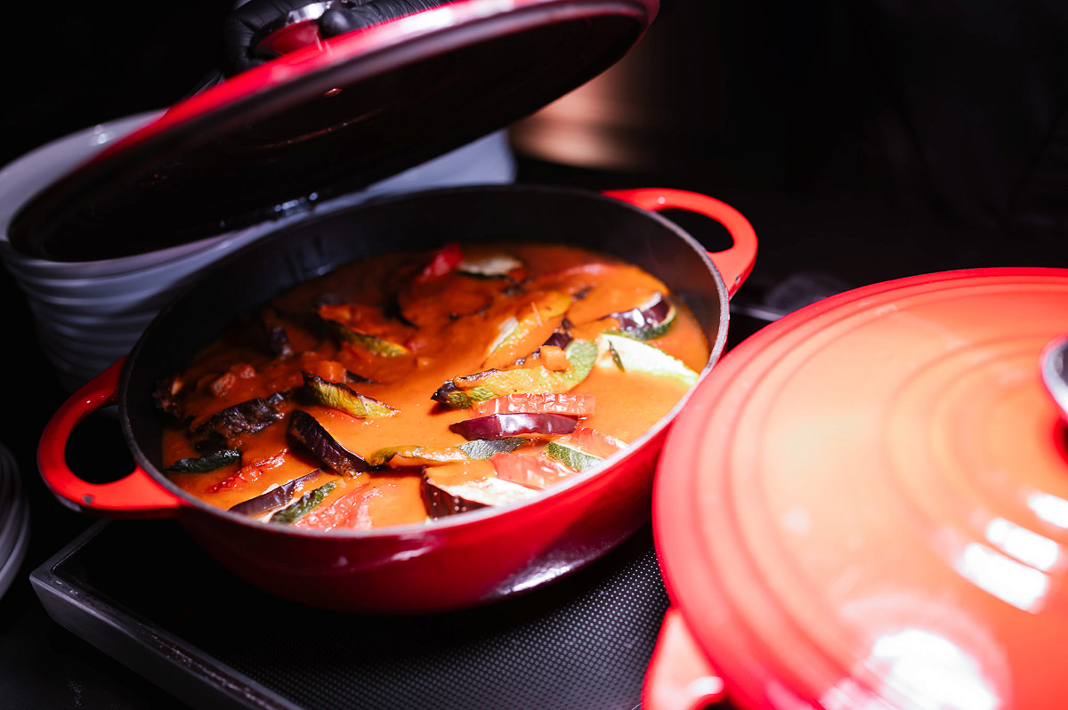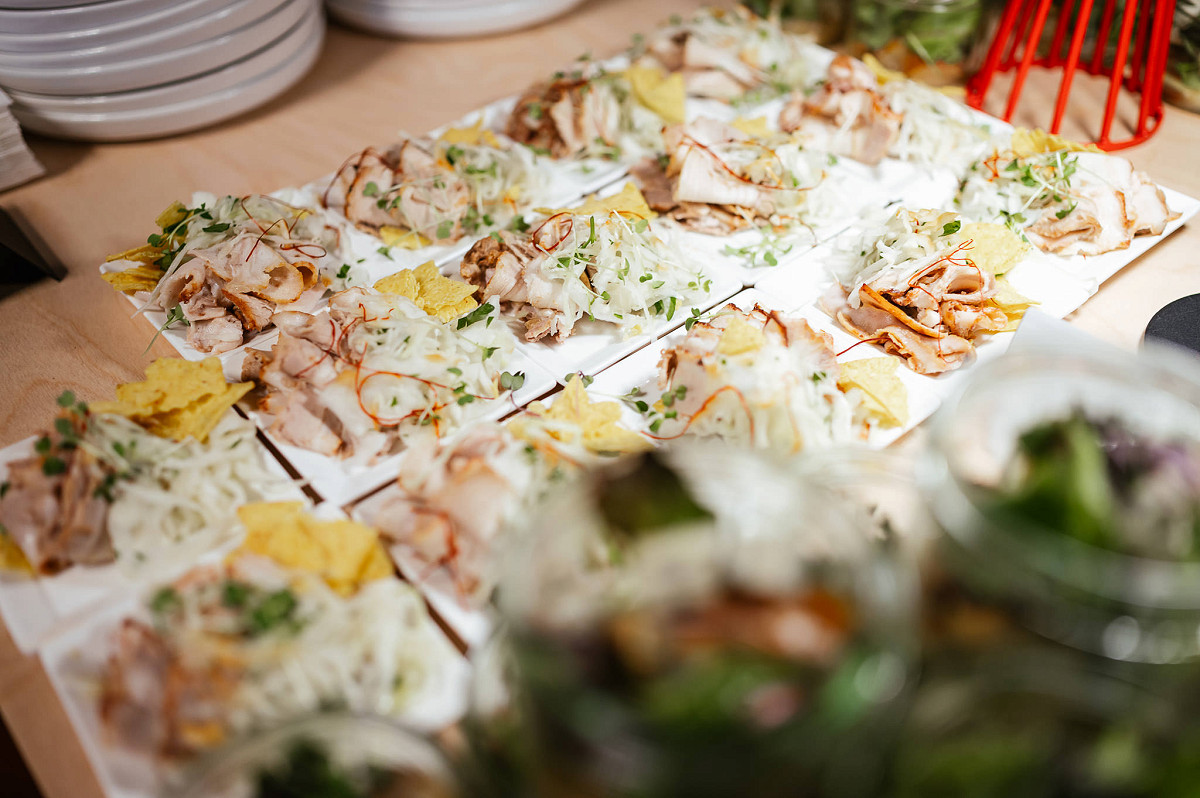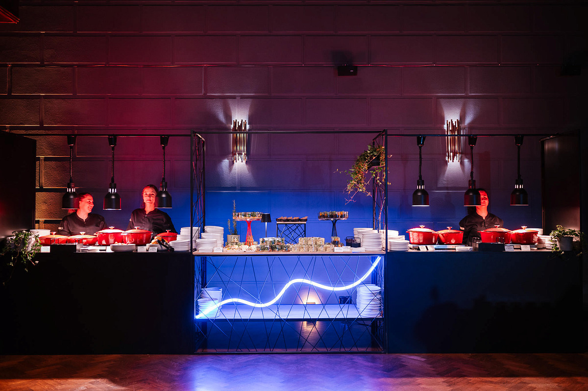 Raut pro 400 osob servírovaný na našem konceptu Signature byl dramaturgií večera sám o sobě. Na stolech s předkrmy hosté našli kachní paštiku s brusinkami v malých skleničkách, salát s hruškou a gorgonzolou. Jako hlavní chod jsme podávali trhané vepřové s omáčkou demi-glace, vegetariánskou lilkovo-cuketovou variaci Toreta, nebo thajské kari s kokosovým mlékem. Kdo chtěl, mohl zůstat u osvědčených řízečků, ale lákaly i nové kombinace chutí.